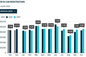 EU new car registrations grew by 1.4% in the first ten months of 2025 compared to the same period in 2024, marking the fourth month of consecutive growth. However, overall volumes remain well below pre-pandemic levels. Battery-electric vehicles (BEVs) reached a 16.4% YTD market share, though still short of the pace required for the transition. Hybrid-electric vehicles remain the most popular choice, with plug-in hybrids continuing to expand their share.
